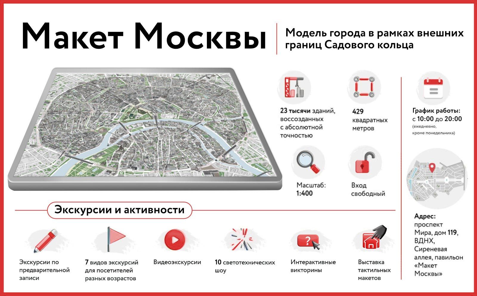 The exhibition center offers an interactive tour of the central Moscow scale model; Visitors will learn about origins of famous monuments and architectural landmarks, why they are important to the city, and what role they play today.