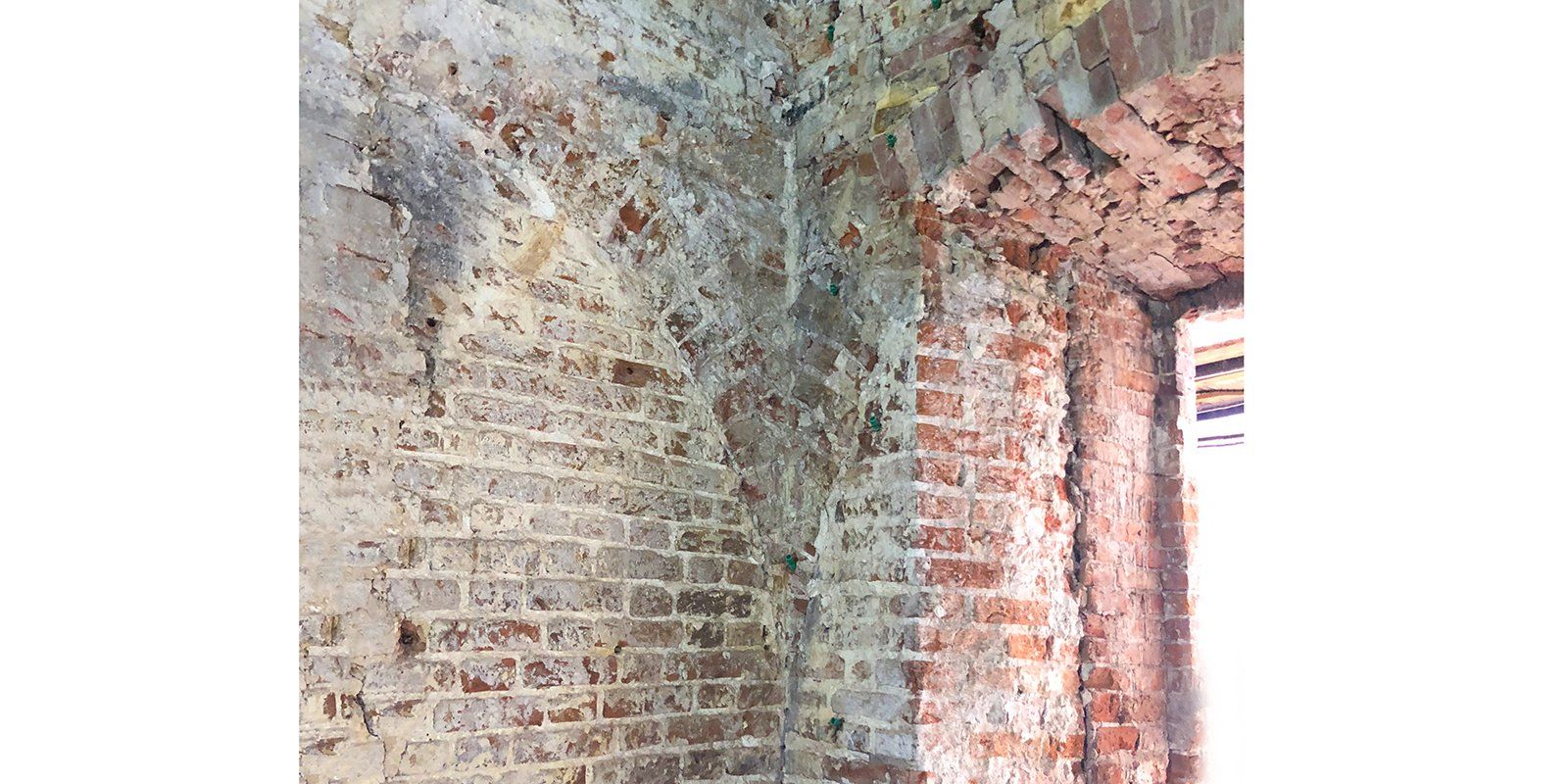 Further inspection revealed that the windows of the Land Surveyors Office were cut through partitions in the old chamber walls while the original window openings were blocked up with stones. As a result, the cornices have partially survived on the walls above the first and the second floors. Moreover, during the building’s renovation, decorative elements that had been cut off the facade also got under the stonework that covered the openings. These include surface-tooled brick ornamented with plaits, rhombuses and more.