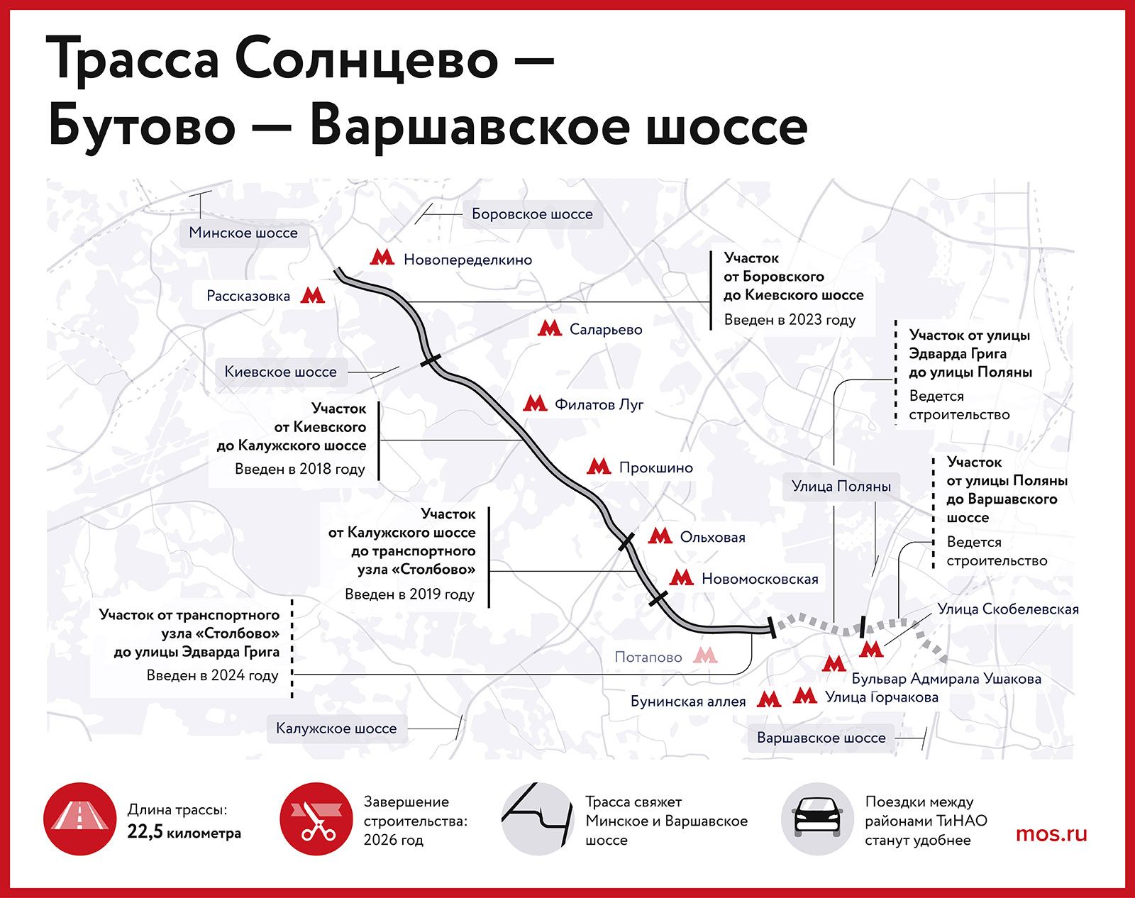 Трасса Солнцево — Бутово — Варшавское шоссе, связывающая пять вылетных магистралей (Минское, Боровское, Киевское, Калужское и Варшавское шоссе), — важнейшая часть транспортного каркаса ТиНАО и дублер юго-западной и южной части МКАД. Ее длина по прямому ходу с учетом Внуковского шоссе составит 26,6 километра, общая протяженность новых дорог с учетом развязок — свыше 95 километров.
