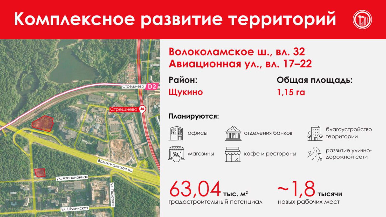 «По программе комплексного развития территорий в районе Щукино построим свыше 63 тысяч квадратных метров недвижимости общественно-делового назначения, включая офисы, магазины, отделения банков, кафе и рестораны. Проект даст городу порядка 1,8 тысячи новых рабочих мест. Также проведем работы по благоустройству территории и развитию улично-дорожной сети», — написал в своем телеграм-канале Мэр Москвы.