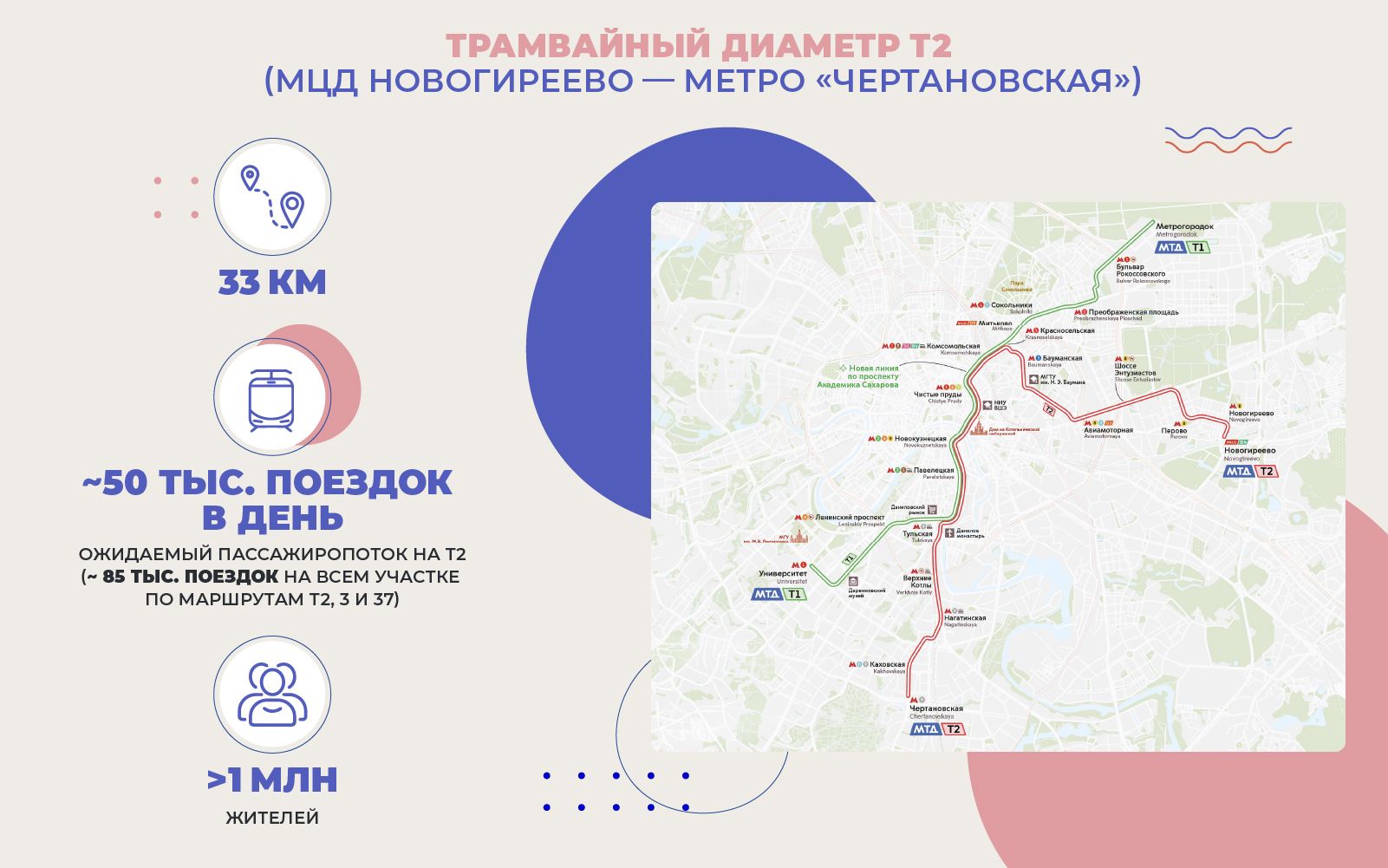 Планируется запустить и второй диаметр — Т2, который пройдет от станции Новогиреево четвертого Московского центрального диаметра (МЦД) до станции метро «Чертановская». Это будет самый длинный городской трамвайный диаметр в мире — 33 километра.