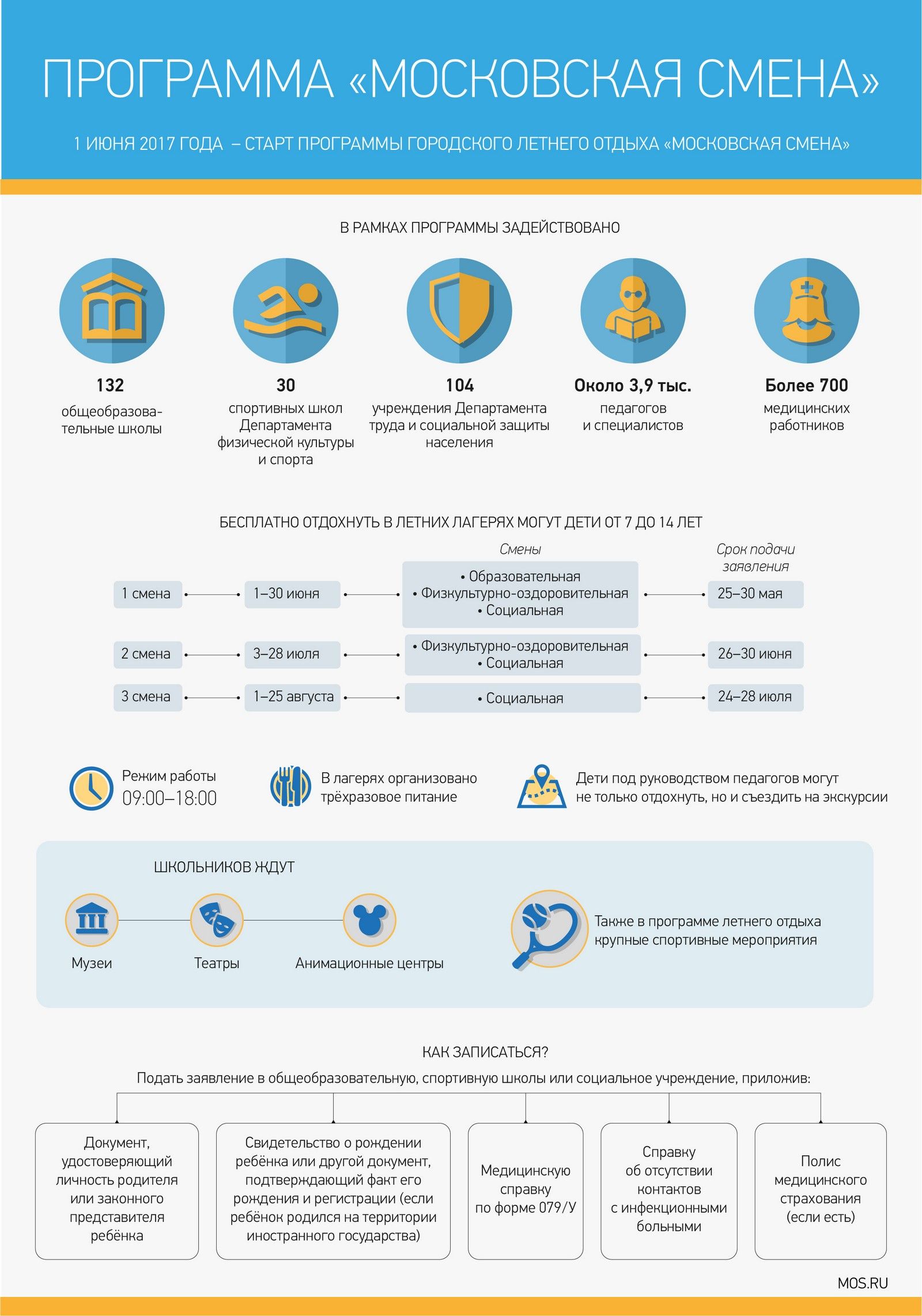 Также будет организовано трехразовое питание. Участие в программе бесплатное. «Московская смена» будет работать в будние дни с 09:00 до 18:00.