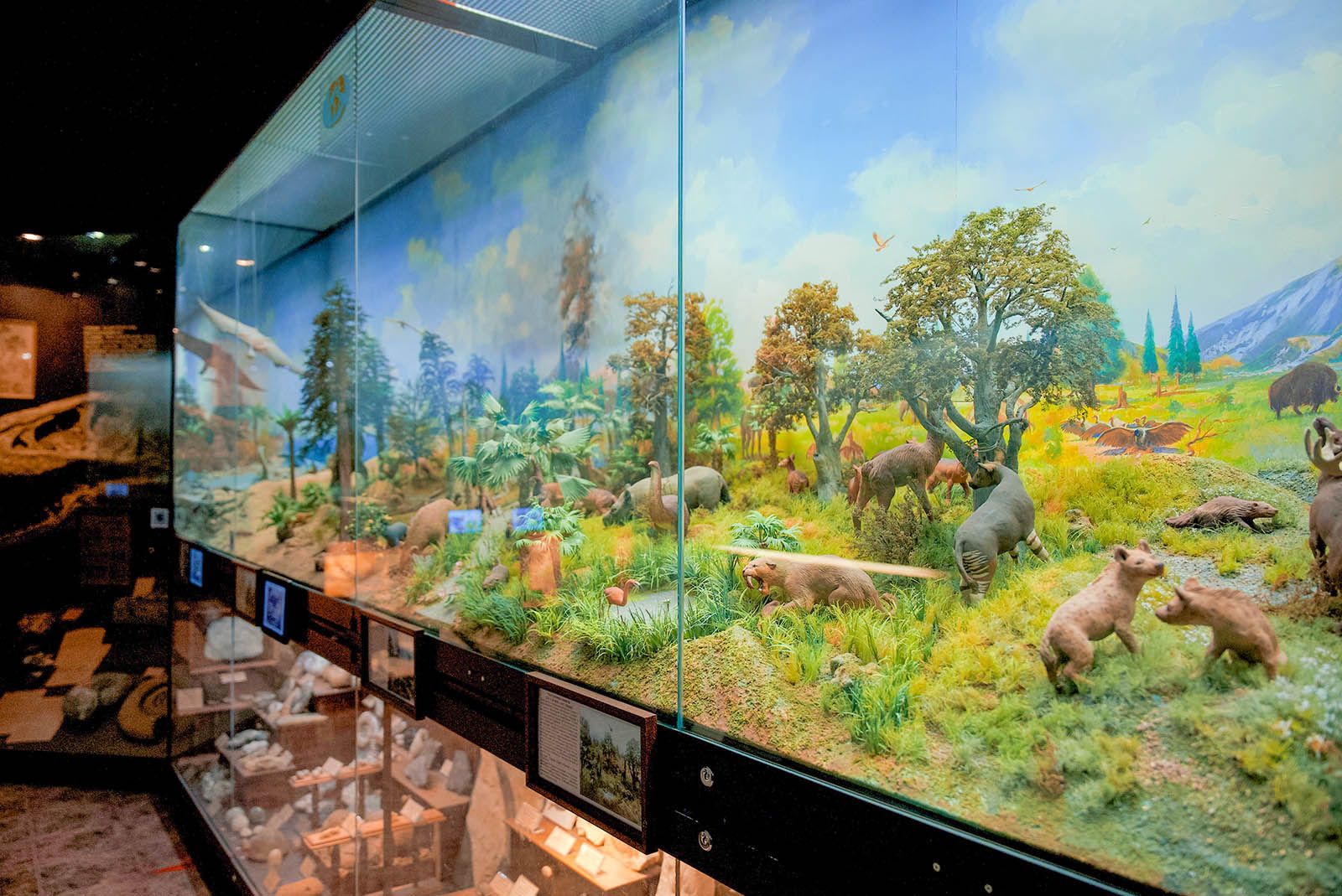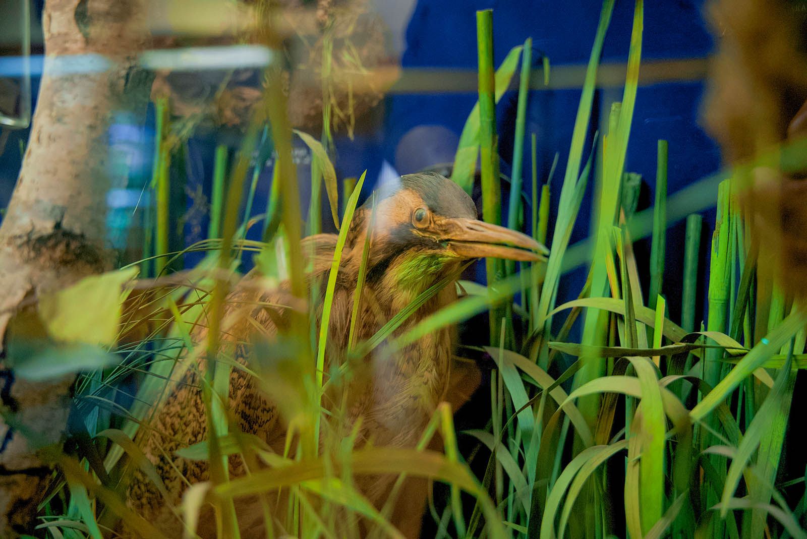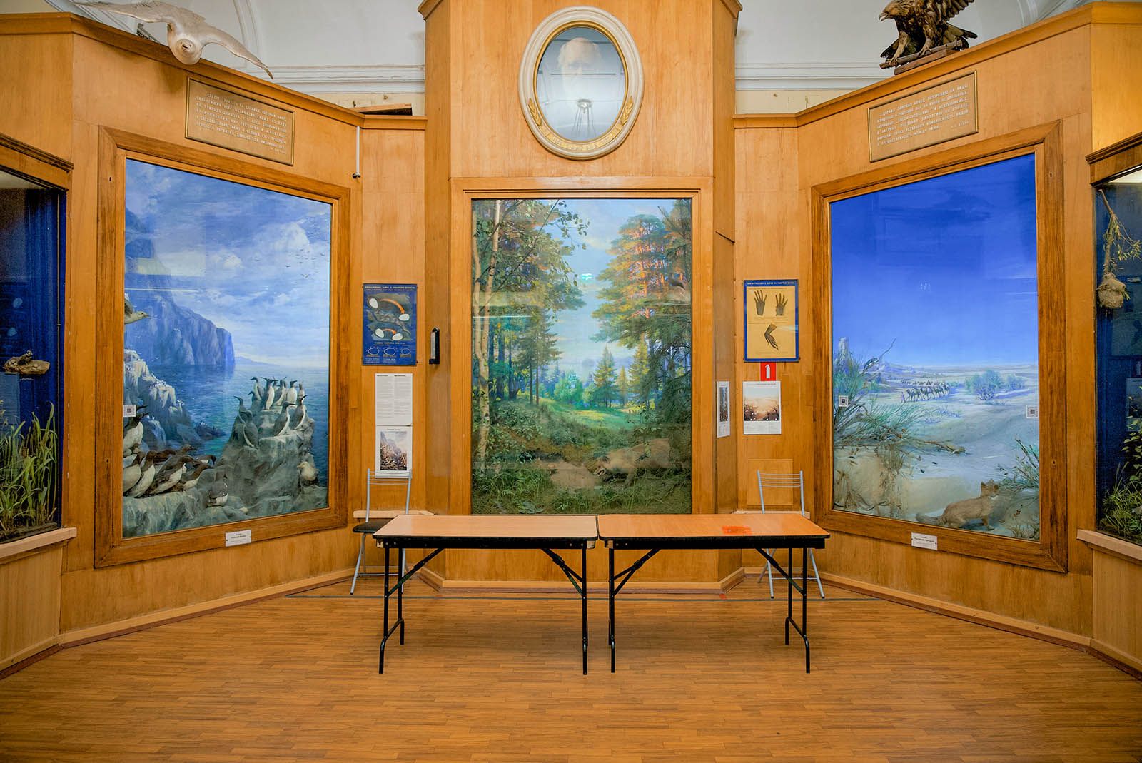 Темно-синий фон, на котором экспонаты ярко выделялись, оказался своеобразным ноу-хау музея. Три большие диорамы выполнила творческая группа художников, макетчиков и таксидермистов под руководством народного художника РСФСР Ефима Исааковича Дешалыта — для каждой из них он лично выезжал на пленэр, делал акварельные зарисовки Кубанского побережья, пустыни Каракум и Рыбинского водохранилища.