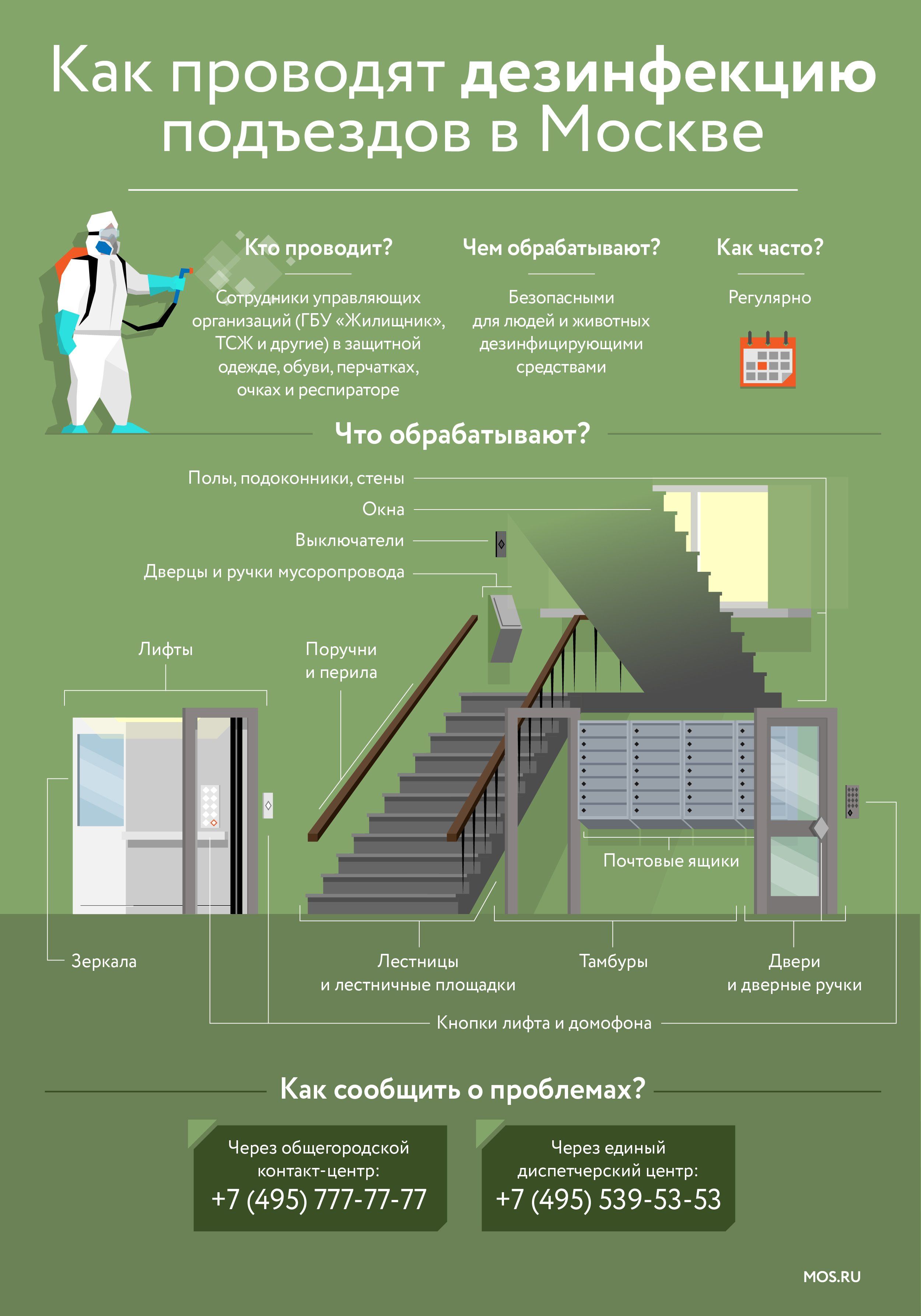 В жилых домах проводят дезинфекцию каждый день. Сотрудники управляющих компаний обрабатывают подъезды, тамбуры, холлы, коридоры, лифты, лестничные площадки и марши. Дезинфицирующими средствами протирают все поверхности, с которыми контактируют люди, — дверные ручки, выключатели, поручни, перила, почтовые ящики, подоконники, кнопки и зеркала лифтов, кнопки домофонов, дверцы и ручки на мусоропроводах.